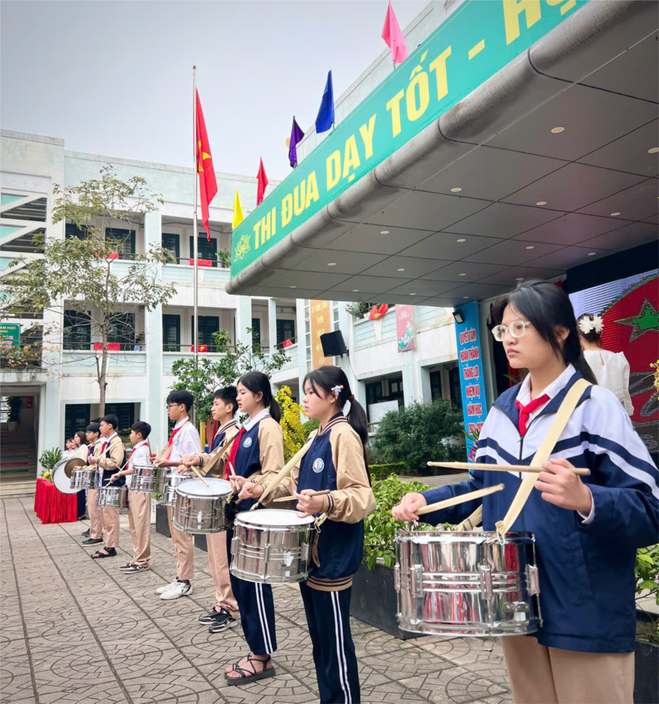 Buổi lễ bắt đầu đúng giờ với phần chào cờ trang nghiêm. Dưới sự chứng kiến của các thầy cô giáo và học sinh, lá cờ Tổ quốc được kéo lên giữa không gian rộng lớn, trong khi bài Quốc ca vang lên trong sự trang trọng, thể hiện lòng yêu nước sâu sắc của thầy và trò nhà trường.