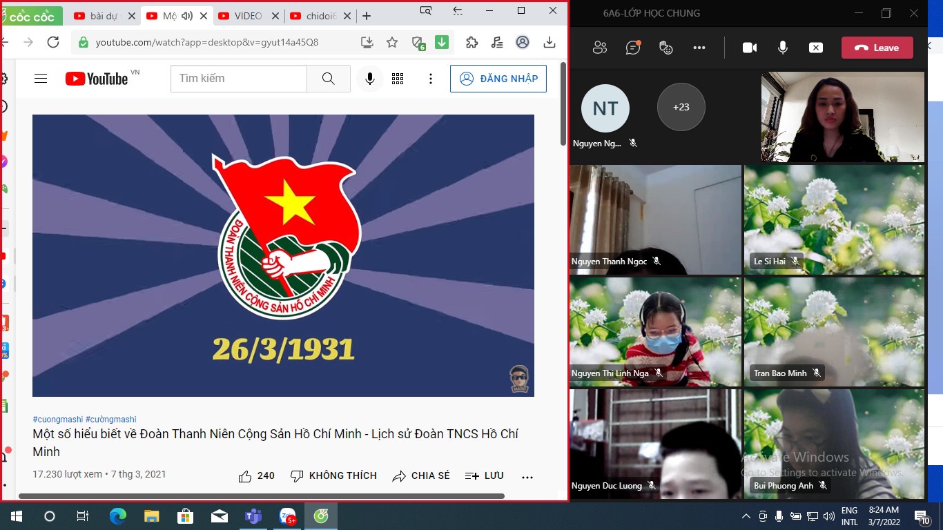 Nối tiếp là nội dung sinh hoạt kỉ niệm Ngày Quốc tế Phụ nữ 08/3. Qua khung hình máy tính, điện thoại, các em học sinh được chiêm ngưỡng những tấm ảnh đẹp của toàn thể nữ giáo viên nhà trường. Các cô giáo xuất hiện trong bộ áo dài truyền thống duyên dáng hay đầy trẻ trung, cá tính trong những trang phục hiện đại, với nụ cười tươi tắn, rạng rỡ, ánh mắt hiền từ thân thuộc. Video khép lại, các em học sinh gửi đến các cô giáo những lời chúc chân thành, tốt đẹp cùng lời cảm ơn những yêu thương, dạy bảo, đồng hành ân cần của các cô trong thời gian qua. Tại mỗi phòng học Teams của từng lớp, các học sinh nam bằng sự sáng tạo và chuẩn bị chu đáo đã tổ chức chương trình mang sắc màu riêng dành tặng cho các cô giáo, các bạn học sinh nữ trong lớp như mini game “Hái hoa dân chủ”, “Lời chúc bất ngờ”, “Ai thương ai”,... Khép lại tiết sinh hoạt là những tiết mục “cây nhà lá vườn” nhưng không thiếu phần chuyên nghiệp của các nam ca sĩ lớp đã để lại nhiều dư âm trong lòng của “một nửa thế giới” trong ngày đặc biệt này.