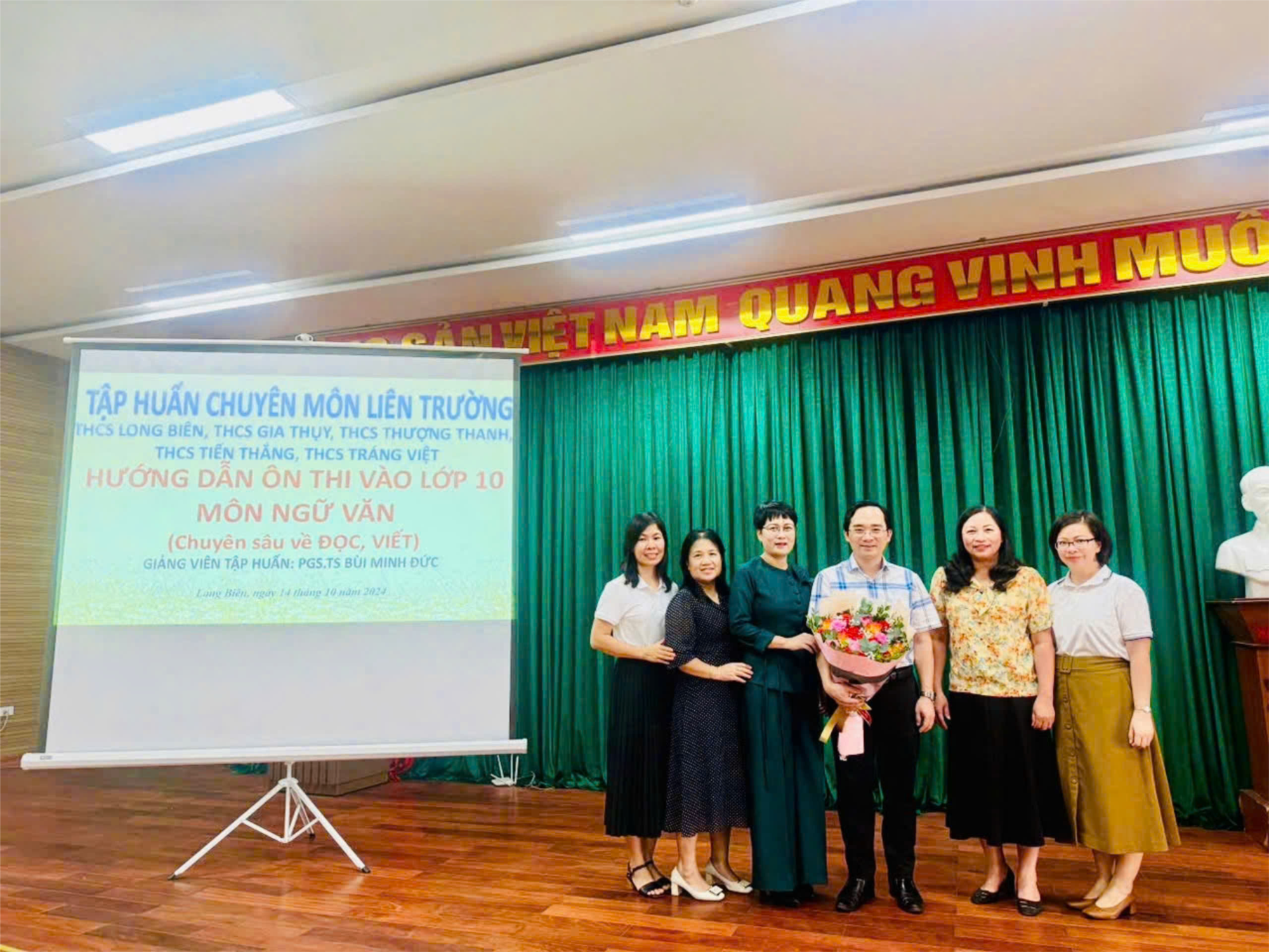Buổi sinh hoạt chuyên môn liên trường tập trung vào nội dung "HƯỚNG DẪN ÔN THI VÀO LỚP 10 MÔN NGỮ VĂN". Các đ/c Hiệu trưởng, Phó hiệu trưởng và các giáo viên dạy Ngữ văn khối 9 của các nhà trường tham dự đầy đủ. Khối liên trường rất vinh dự được chào đón Phó giáo sư, Tiến sĩ Bùi Minh Đức - Trưởng khoa Ngữ Văn trường Đại học Sư phạm Hà Nội II làm báo cáo viên của chuyên đề. Thầy giáo đã chia sẻ một cách súc tích, cô đọng các nội dung chuyên sâu về phần Đọc, Viết, bám sát các định hướng thi vào 10 THPT của Sở GD&ĐT Hà Nội.