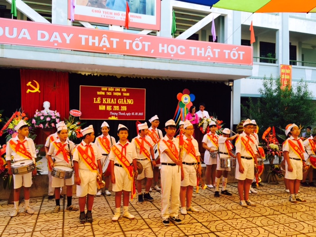 Trong buổi Lễ khai giảng năm nay, nhà trường long trọng đón 296 em học sinh khối 6 đã tuyển sinh về nhà trường. Chương trình đón học sinh khối 6 gây nhiều ấn tượng cho thầy và trò nhà trường cũng như các vị đại biểu. Buổi lễ khai giảng được tổ chức long trọng, đúng theo sự chỉ đạo của các cấp. Sau màn hát Quốc ca của cán bộ - giáo viên – công nhân viên và học sinh nhà trường, cô Trần Thị Thanh Hà – Phó Hiệu trưởng nhà trường, đại diện lãnh đạo nhà trường đọc thư Chủ tịch nước. Toàn thể học sinh nhà trường đứng nghe với sự xúc động và niềm vui khôn tả. Tiếp theo, cô giáo Ngô Hồng Giang - Bí thư chi bộ - Hiệu trưởng nhà trường lên tuyên bố khai giảng năm học mới. Trong bài tuyên bố, cô Hiệu trưởng đã nhấn mạnh những nhiệm vụ trọng tâm của nhà trường, đồng thời động viên thầy và trò nhà trường thực hiện tốt nhiệm vụ dạy và học để đạt kết quả cao trong năm học 2015- 2016. Tiếng trống mở đầu cho năm học mới được cô Hiệu trưởng Ngô Hồng Giang thực hiện vang lên trong ngày Lễ khai giảng như thúc giục thầy và trò trường THCS Thượng Thanh ra sức phấn đấu đạt nhiều thành tích cao trong công tác dạy và học.