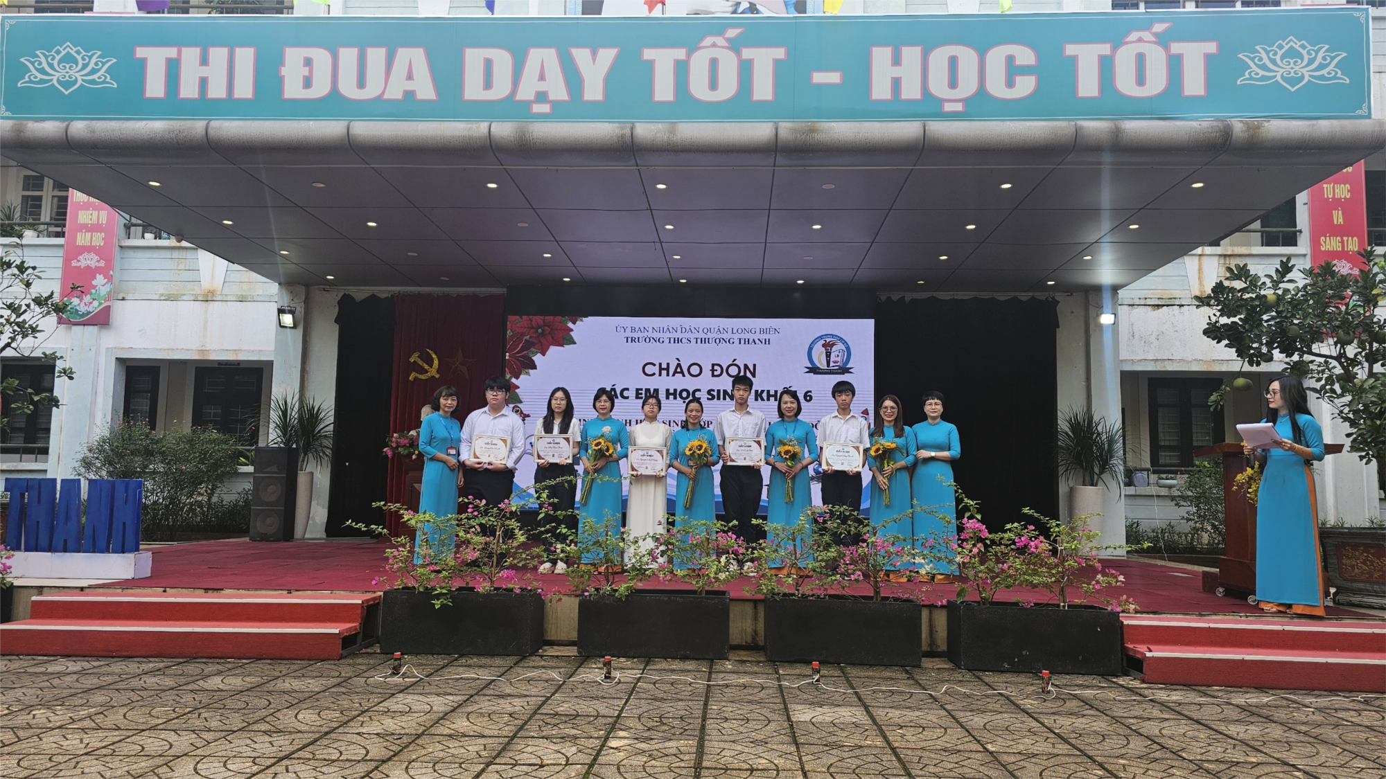 Đến với buổi lễ, nhà trường được vui mừng chào đón Cô giáo Trần Thị Ngọc Yến, Bí thư chi bộ, HT nhà trường; Cô giáo Đỗ Thị Thu Hoài, Phó Bí thư chi bộ, Phó HT nhà trường; Cô giáo Nguyễn Thị Sơn Hường, Phó HT nhà trường, Bác Nguyễn Văn Dũng – Trưởng ban đại diện hội CMHS và các em học sinh Thủ khoa, học sinh đỗ chuyên trong kì thi vào 10 THPT, 170 học sinh khối 6 năm học 2024-2025.