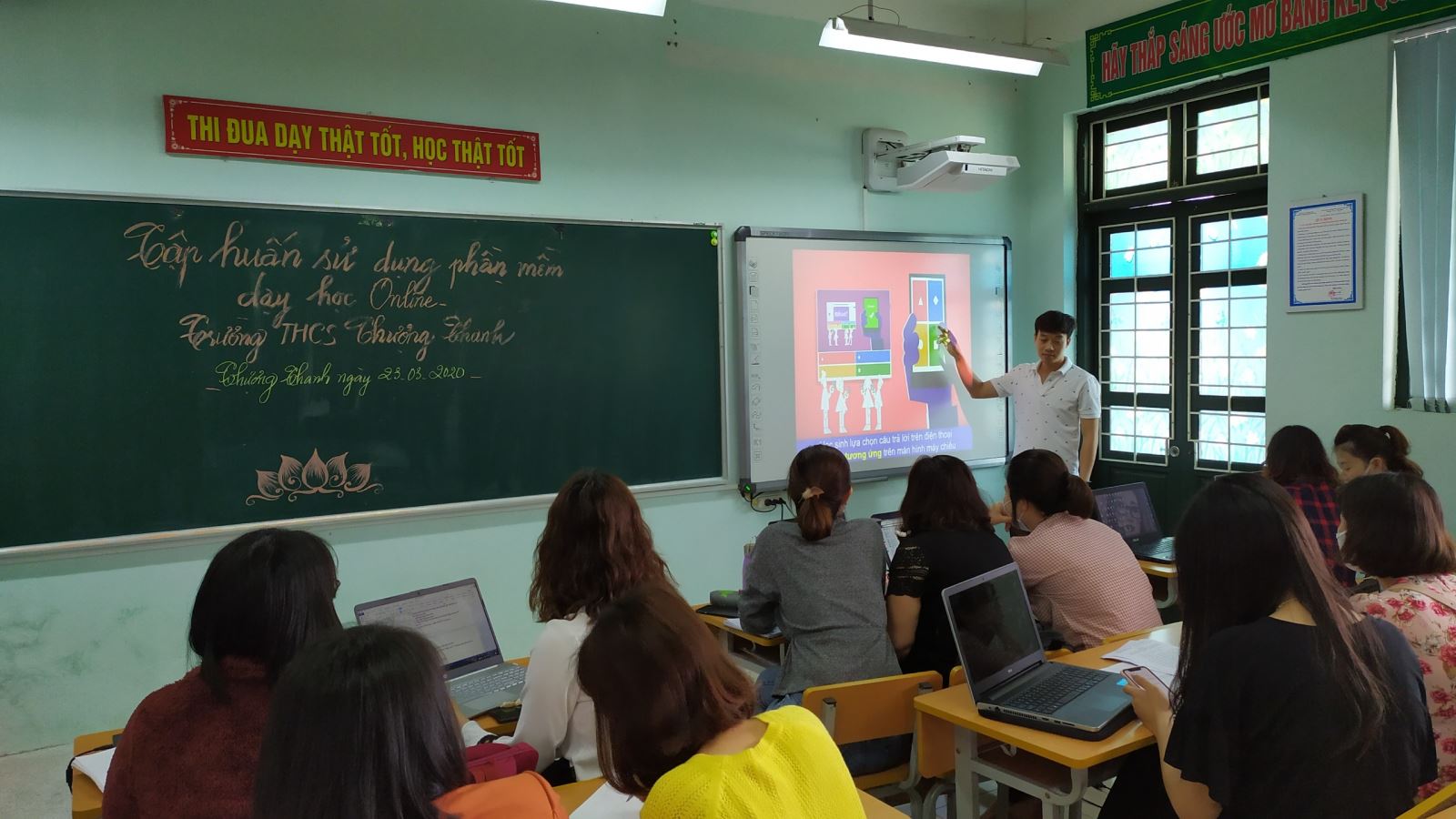 Trong buổi tập huấn, các giáo viên được trang bị, hướng dẫn cách sử dụng những công cụ, phần mềm miễn phí (zoom, violet, kahoot,...) để xây dựng lớp học trực tuyến. Đồng thời được giải đáp những vấn đề mà bản thân còn băn khoăn khi tổ chức lớp học trực tuyến thu hút đông học sinh. Trước đó, trong thời gian học sinh nghỉ phòng chống dịch Covid-19, các biện pháp kết nối với học sinh như: zalo, facebook, email… luôn được nhà trường duy trì, đảm bảo hỗ trợ các em về việc học cũng như những thông tin về dịch bệnh.