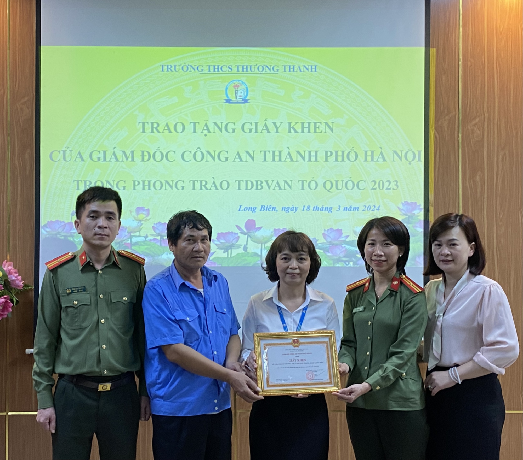 Ngày 18/03/2024, trường THCS Thượng Thanh vinh dự được đón nhận Giấy khen của Giám đốc Công an Thành phố Hà Nội: "Tổ văn phòng đạt thành tích xuất sắc trong phòng trào Toàn dân bảo vệ an ninh Tổ quốc năm 2023". Hy vọng rằng, tổ văn phòng của nhà trường sẽ tiếp tục phấn đấu và phát huy hơn nữa vai trò của mình trong các năm học tới, đảm bảo công tác an ninh an toàn trường học.