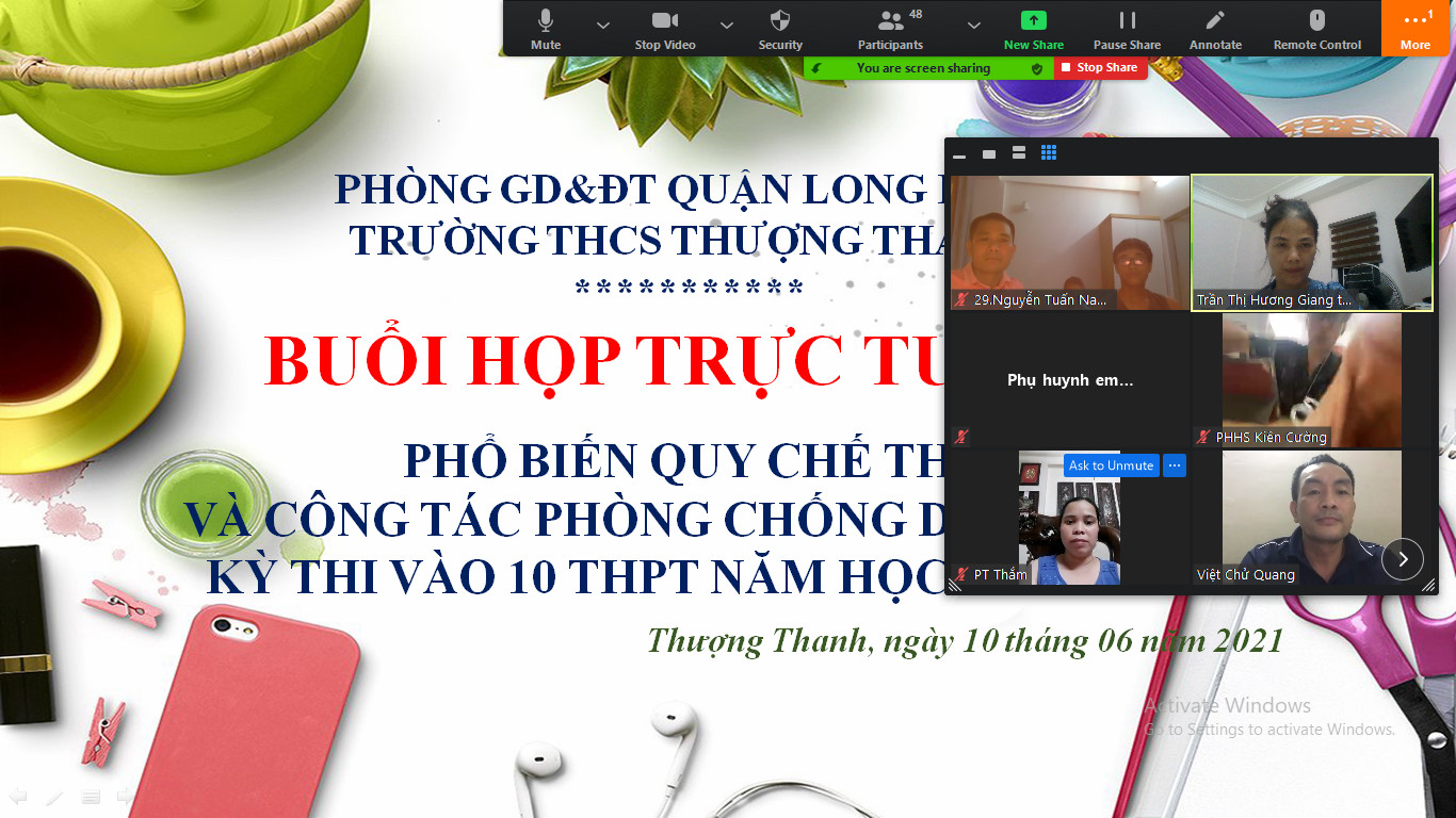 Thực hiện sự chỉ đạo của PGD&ĐT Quận Long Biên tại công văn số 155/PGD&ĐT ngày 6/6/2021 về việc tổ chức triển khai công tác hướng dẫn tới PHHS- HS các nội quy, quy chế thi tuyển sinh vào lớp 10 THPT năm học 2021 – 2022 trong tình hình dịch Covid-19 có diễn biến phức tạp, 20h00 ngày 10/06/2021, trường THCS Thượng Thanh tổ chức họp trực tuyến phổ biến quy chế thi và công tác phòng chống dịch bệnh kì thi tuyển sinh vào 10 THPT năm học 2021 - 2022 qua phần mềm Zoom Meeting.