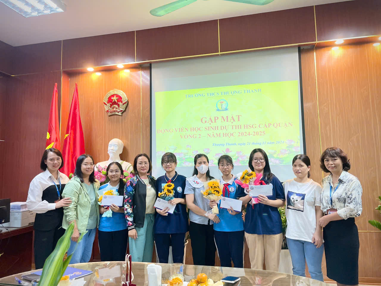 Nhằm khích lệ, động viên các học sinh tham dự kỳ thi học sinh giỏi cấp Quận sắp tới, chiều ngày 21/11/2024, Ban Giám hiệu trường THCS Thượng Thanh đã tổ chức buổi gặp mặt để động viên các em học sinh trong đội tuyển học sinh giỏi của nhà trường. Phát biểu trong buổi gặp mặt, nhà giáo Đỗ Thị Thu Hoài - Phó bí thư chi bộ, Phó hiệu trưởng phổ biến quy chế thi và trao đổi, dặn dò một cách cẩn thận, chu đáo, yêu thương đến tất cả học sinh. Cô Lê Thị Mai Oanh – giáo viên môn KHTN, đại diện các thầy cô giáo lãnh đội cũng chia sẻ kinh nghiệm, ân cần nhắc nhở những điều phải chú ý để các em làm bài thi thật tốt. Đại diện các học sinh giỏi của nhà trường, em Hoàng Kim Ngọc, học sinh lớp 9A2, gửi lời tri ân tới ba mẹ, thầy cô đã sát cánh cùng các em trong suốt thời gian ôn tập đồng thời xin hứa quyết tâm bước vào kỳ thi với nỗ lực cao nhất. Cuối cùng, nhằm khích lệ, động viên tinh thần hăng say học tập và ôn thi của các em, Ban Giám hiệu nhà trường cũng đã gửi tặng các em những phần quà nhỏ đầy ý nghĩa. Chúc các em học sinh sẽ BÌNH TĨNH - TỰ TIN phát huy hết khả năng và kiến thức đã được trau dồi trong thời gian qua để đạt được nhiều thành tích cho cá nhân và nhà trường!