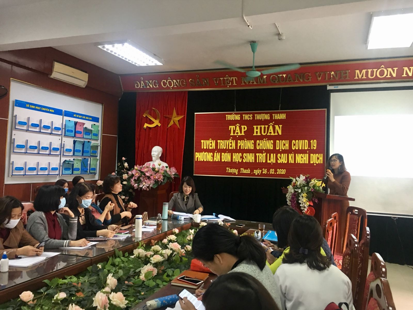 Sáng ngày 26/ 02/ 2020, đồng chí Ngô Hồng Giang- Hiệu trưởng- Tổ trưởng tổ công tác phòng chống dịch Covid- 19 Trường THCS Thượng Thanh đã tổ chức tập huấn tuyên truyền phòng chống dịch và phương án đón học sinh trở lại sau kì nghỉ dịch cho 100% cán bộ, giáo viên, nhân viên nhà trường. Buổi tuyên truyền tập trung vào một số nội dung trọng tâm sau:
